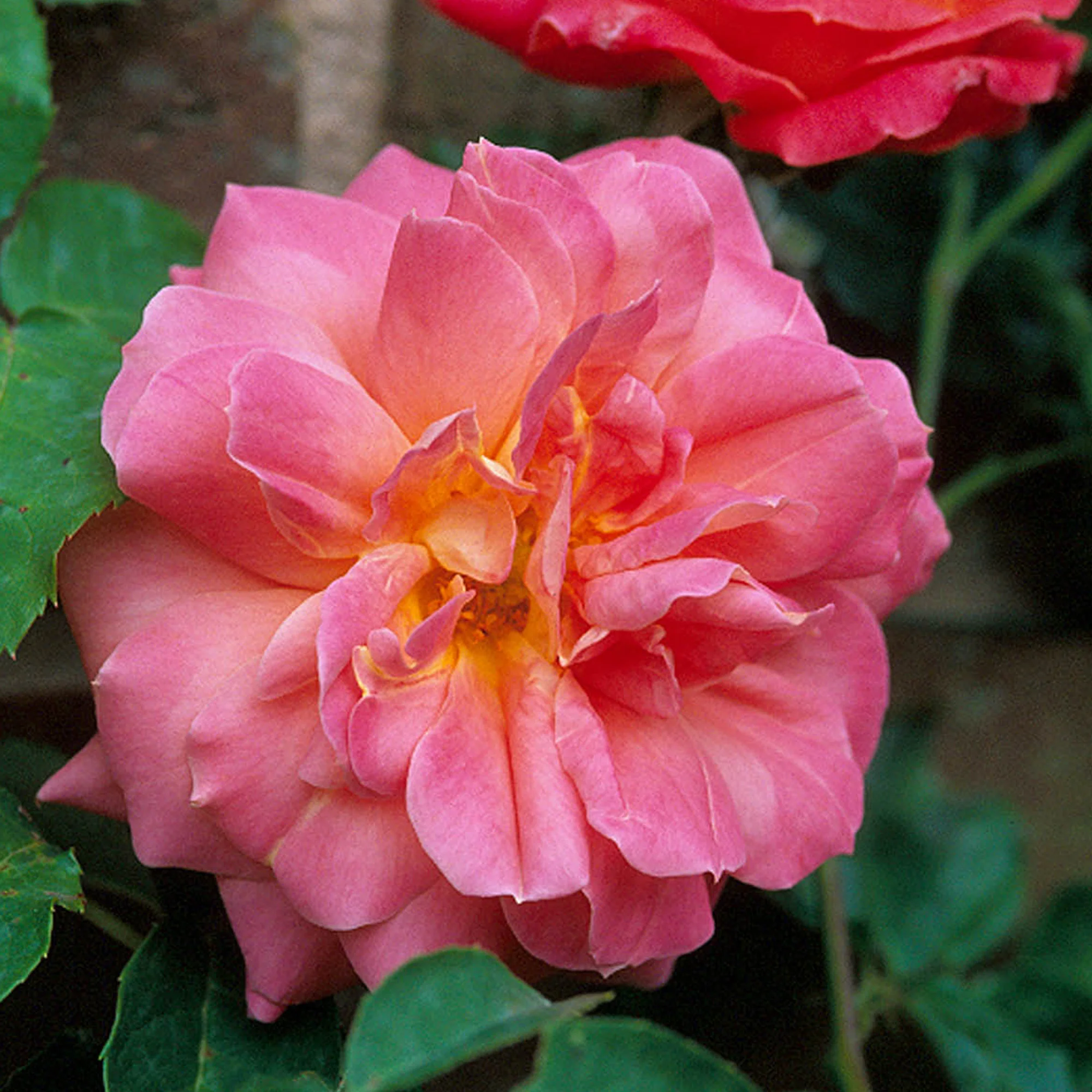 Attractive, medium-sized, rosette-shaped flowers. The upper sides of the petals are very bright coral-pink and the under sides are much yellower. Repeat flowers in autumn, followed by rounded orange hips. A reasonably vigorous climber with flexible, easy to train stems. 1974.