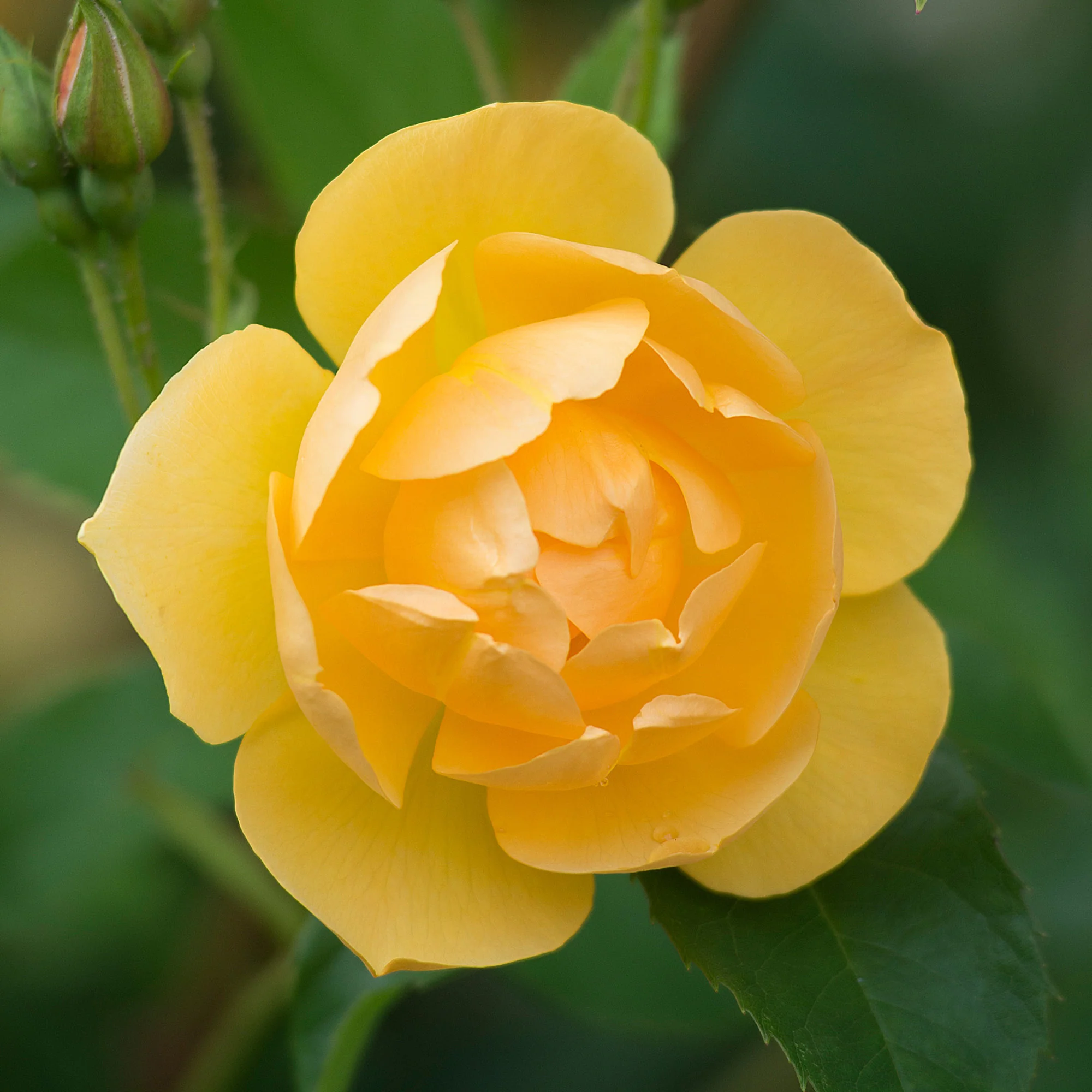 Numerous flowers are held on long, slender, arching stems – nodding their heads slightly to give a most pleasing effect. The flowers are loosely cupped and a little more than semi-double; their colour being a lovely pure yellow. They have a musky scent with a hint of orange blossom. It forms a tall, vigorous shrub with a rather informal habit. David Austin, 1998.