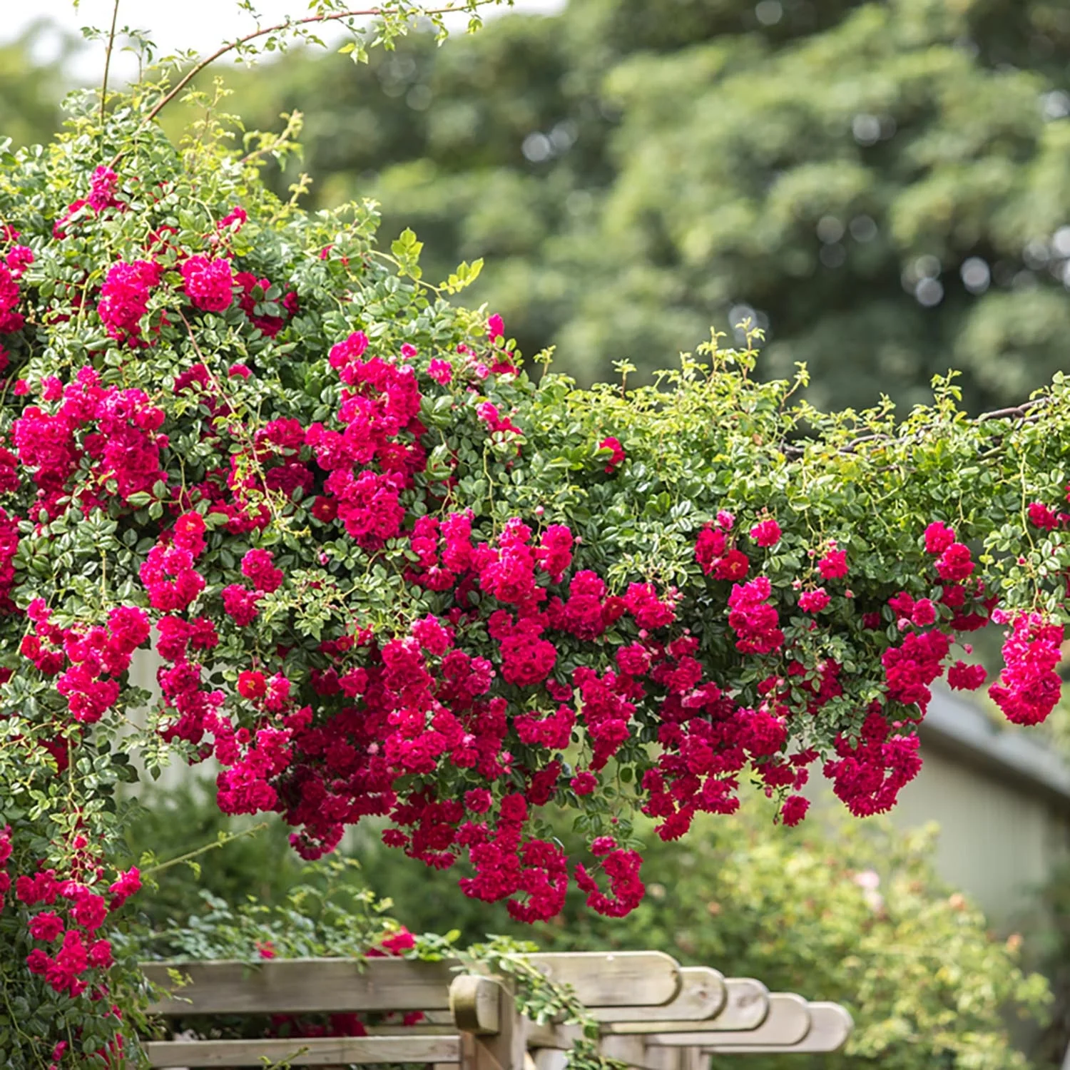 They are held in large clusters against dark, shiny foliage. It starts to flower around midsummer, continuing into September. The long, flexible growth makes it easy to train. Norman, 1951.
