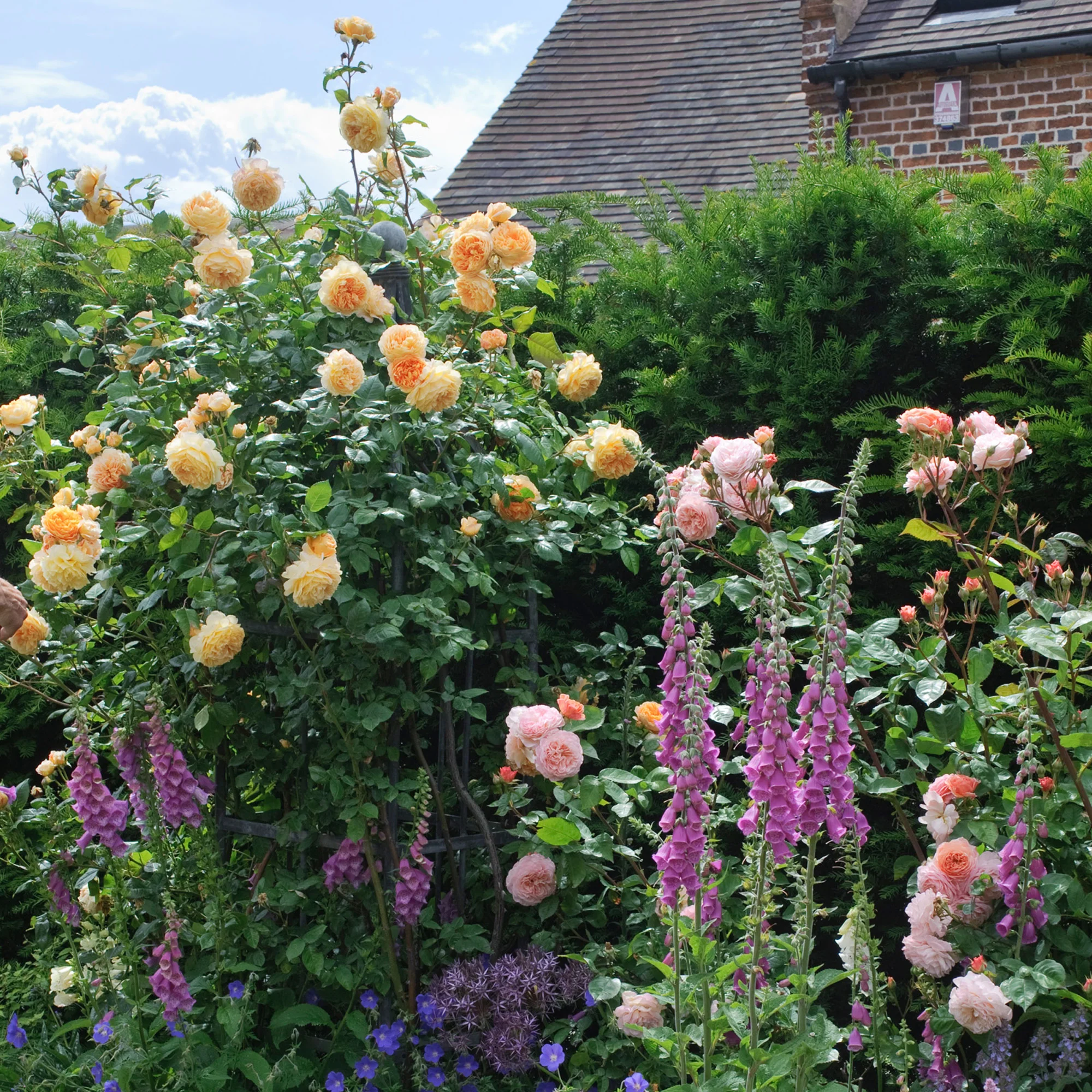 A vigorous climber, bearing quite large, many petalled, neat rosette flowers in a lovely shade of apricot-orange. They have a medium-strong Tea fragrance. There is plentiful, glossy foliage. David?Austin, 1999.