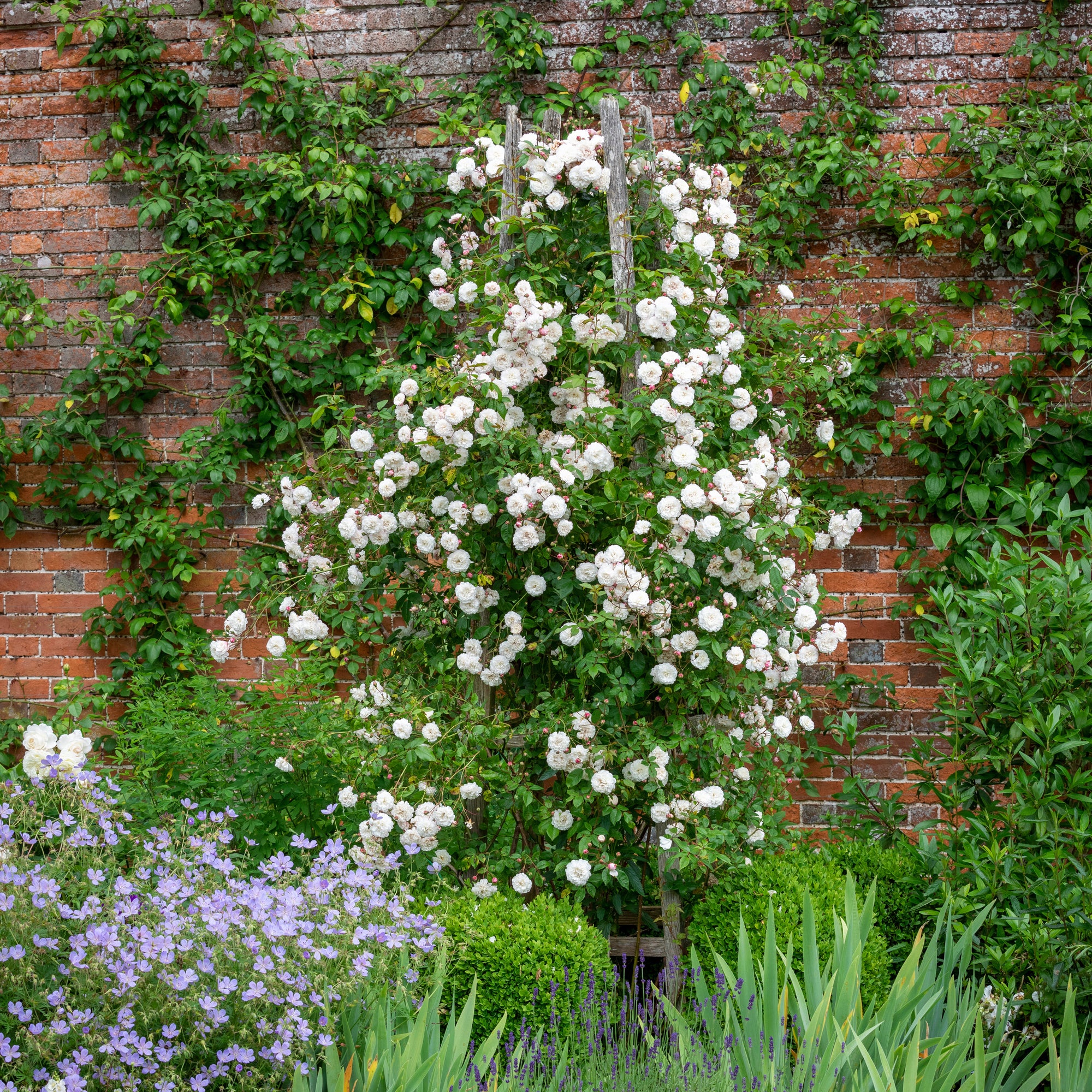 Small, closely packed pompon flowers of creamy white, flushed pink at first, are held in large, slightly hanging clusters and have a delicate primrose fragrance. They are produced quite late in the season, around mid-July. Almost evergreen; it forms a dense mass of small, dark, neat foliage. Jacques, 1827.