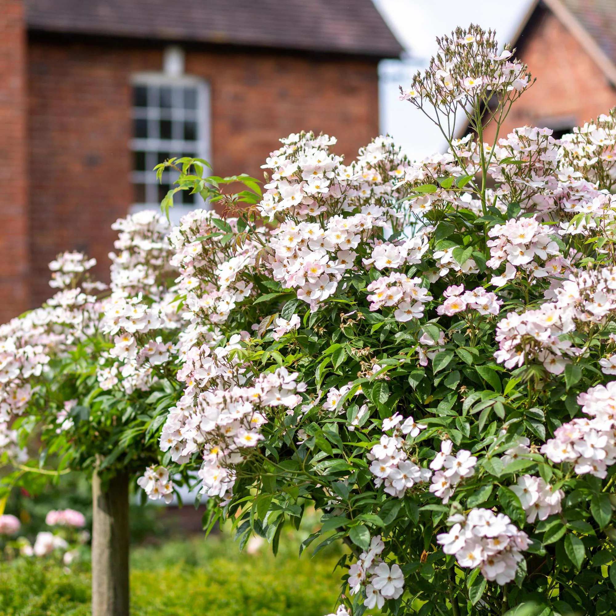 A beautiful rambler smothered with huge bunches of small, single blooms. These are blush white, delicately tinted with pale pink at the edges, later becoming almost pure white, creating the impression of apple blossom. They have a strong, pleasing musky fragrance, which carries over a wide area. It produces masses of small, oval, orange-red hips in the autumn. The growth is strong and bushy with elegant, pointed, glossy dark green foliage. Lester Rose Gardens, 1946.