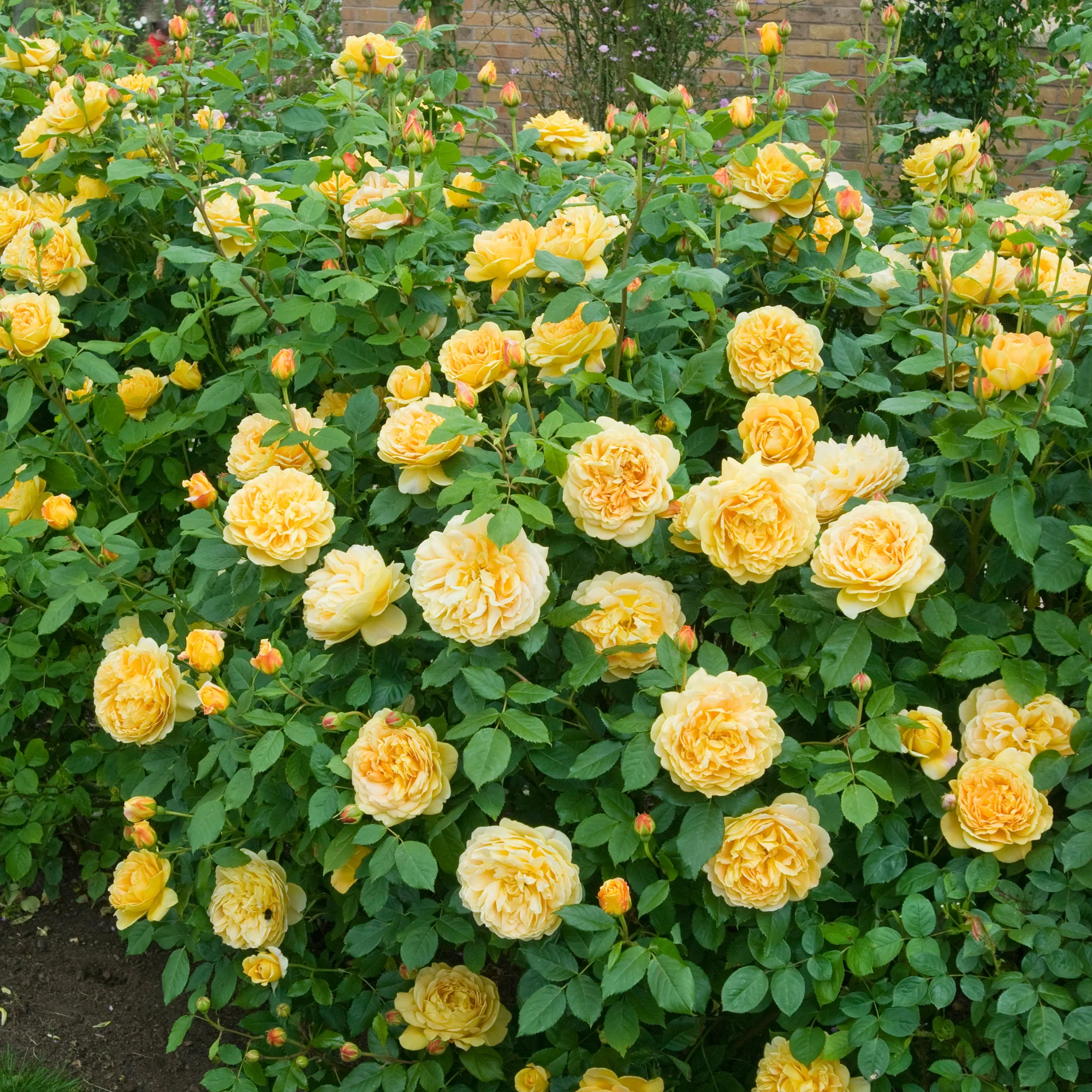 One of the largest-flowered English Roses, bearing rich yellow blooms in the form of giant cups. They have a strong Tea fragrance, developing wonderfully combined notes of Sauternes wine and strawberry. It forms a rounded shrub, with ample foliage – the flowers held beautifully poised on long, arching branches. David Austin, 1992.