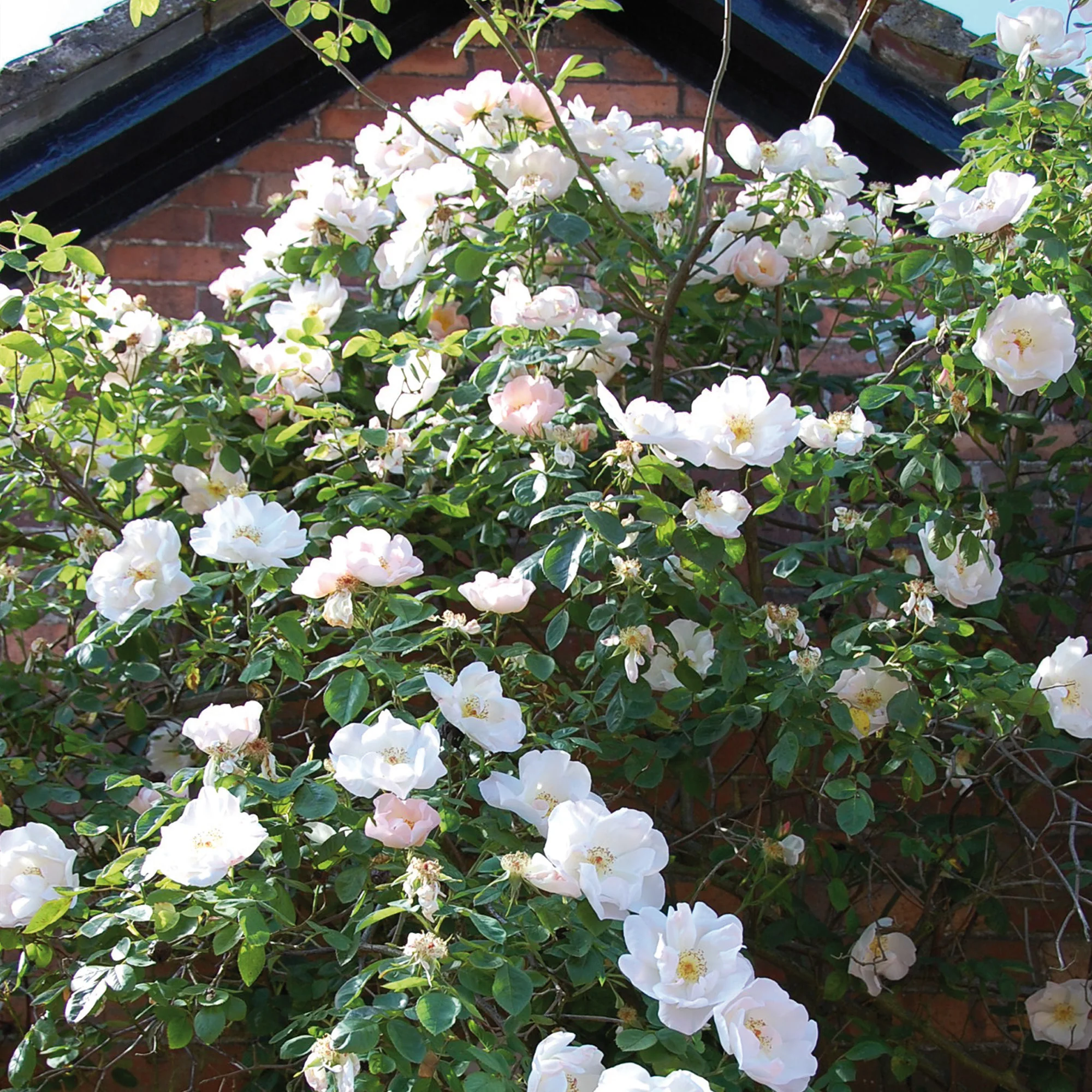 One of our tallest English climbers. Its large, single, blush white flowers gradually fade to white. They have a delicious myrrh fragrance. Even though it does not repeat, it produces a magnificent display in early summer and bears many hips in autumn. David?Austin, 1968.